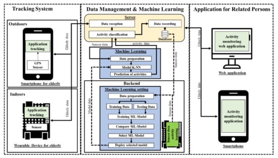 In Figure 1, the proposed system consists of three components: tracking system, data management and machine learning, and application for related persons. The first component involves technologies that are applied to track the elderly both indoors and outdoors. The second component has the management of data derived from the tracking system. The final component applies the collected and analyzed data, and informs caregivers or related persons.