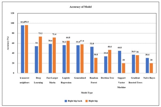 In this work, we tested the classification of 9 activities (more details in Section 4.1), such as walking, running, sitting, standing, and sleeping with ten models using the R program, as shown in Figure 2. Besides, we collected data from the right hip and right hip position to find a suitable position for use. The graph in Figure 2 shows that the k-NN (k-nearest neighbors) classifier was the most accurate in classifying activities and that the right hip position is suitable for use. After choosing a model, we developed the model to run on the server in the form of a web application. The selected model is applied to develop a web application to the user. The classification settings of the system are designed to be flexible for increasing activity types, changing the k value, or training information updates. The flexibility of this classification makes it always possible to improve classification efficiency and to apply the system to a wide variety of activities. The system deployed will predict the new activities of elderly from the models learned using the provided dataset.