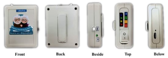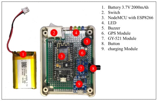 The GPS module and GY-521 module are applied to receive the personal activities data. The GPS module uses signals from satellites and then calculates the geographical position (latitude, longitude), sea-level elevation, and movement speed. The GY-521 module combines the capabilities of many sensors, including angular acceleration measurement, angular velocity measurement, angle measurement, and temperature. The system uses the data from the GY-521 module for activity classification and the data from the GPS module to identify the geographic location of the elderly. Furthermore, the device has a button for sending emergency help messages to the telephone number specified by the elderly in settings. In this case, we use the battery capacity of 2000 mAh and 3.7 volts. The tracking device continuously sends data once every second. Users can use it for approximately 15 h on a single charge. The NodeMCU with ESP8266 is a microcontroller that comes with esp8266, which can connect to a Wi-Fi network. It is necessary to set up the connection of the device to home Wi-Fi or smartphones of the elderly. The components of the tracking device are packed in the box, as shown in Figure 4.