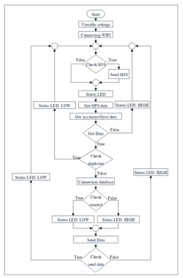 As for software development, we use the Arduino IDE to develop a set of instructions for tracking devices. This set of instructions controls receiving data from sensors, process data, and send data to the server. The process is summarized in the flowchart in Figure 5.