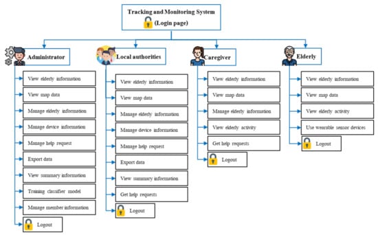 The last component is an application for persons related to the elderly, such as grandchildren, elderly caregivers, or elderly care agencies. Those related persons use the web application to track and monitor the activities of the elderly. Furthermore, the system sends emergency alert SMS (Short Message Service) to elderly caregivers and agencies that the elderly need. Emergency alerts will be sent in the event of a fall or if the elderly press the emergency button on the wearable device. Access to the elderly information on the web application differs by type of user, according to their duties. For example, the grandchildren can only access the elderly in care, while the elderly care agencies can access information on all the elderly in the community.
