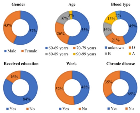 The study area was Moo 5, 6, 7, and 8, in Makham Tia Subdistrict, Mueang Surat Thani District, Surat Thani Province, Thailand. This area was chosen because of the validation of experimental data. Moreover, the proposed system arises from the needs of stakeholders involved in elderly care. There is the village headman, village volunteers, sub-district service organization, sub-district hospital, and Ministry of Social Development and Human Security. The total area of the four villages in 2115 hectares, the population is 1640 persons, with 807 males, 833 females, and 328 elderly persons (60 years or more). This study randomly sampled the elderly data of 240 persons, including 112 males and 128 females. The general information on gender, age range, blood type, education, work, and chronic diseases is summarized in Figure 7.