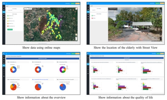 Another essential part of software development is web applications and commands on the server. This part controls the working and decisions of the system. We develop web applications using PHP, HTML, JAVASCRIPT, and using SQL for database management. Furthermore, external systems are used to increase the efficiency of data display and more comfortable operation. Google Maps API is used to develop online maps that display spatial data with adjustable views, SMS services for sending notification messages, Google Chart API for creating graphs that can be updated in real-time. The system has different functions and access to information for each group of users since the elderly information is personal information that cannot be shared. Administrators or local authorities have access to all the elderly information in their area of responsibility. However, an elderly caregiver or elderly can access the elderly information of them only, with the interface structure shown in Figure 6.