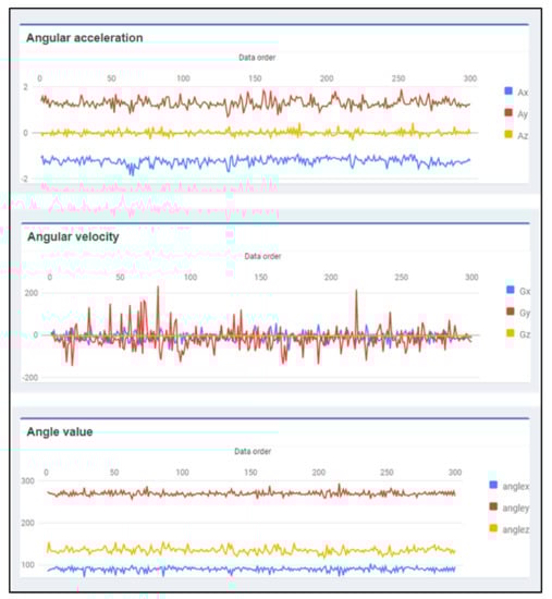 In Algorithm 1, we use this algorithm to classify the data received from our wearable devices. The input of the algorithm consists of training data sets (D) covering all types of activities required, category of activity classes (C) paired with training data sets, k values, and data required to classify activity classes (test object x). The output is the class label or type of activity derived from the classification (). The k-NN algorithm finds the distances between test data (test object x) and each data point (y) in the training set (D), using the Euclidean distance. Data from wearable devices for activity classification consists of 9 factors, which are 3-axis angular acceleration (A-X, A-Y, A-Z), 3-axis angular velocity (G-X, G-Y, G-Z), and 3 angles (Angle-X, Angle-Y, Angle-Z). An example of data for walking activity is shown in Figure 9. Therefore, the value n in the Euclidean distance equation of this algorithm is nine or the Euclidean distance equation for 9-dimensional space. The data with the closest distance will be selected for N numbers, in which the selected amount depends on the assigned k. The final step is to find the argument maximum of the class value from the selected data. The important thing about using this algorithm is that it should have suitable training data size and k value.