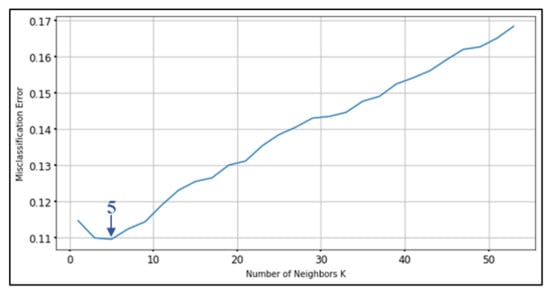 In the case study, we tested the elderly tracking system with ten volunteers, aged 62 to 73 years old, three males and seven females. Moreover, we use 2 experienced persons for activity movement that describe the dataset in Section 4.1. The test collected movement data for a total of 9 activities: sitting, standing, walking, running, falling, laying on one’s back, laying face down, laying on the left side, and laying on the right side. We used 11,000 data records as training data to find the appropriate k value and to test the accuracy of the model. The critical thing to note with the k-NN algorithm is that the number of features and the number of classes are not involved in determining the value of k. The selection of k is essential. When the k value is small, it means that noise will have a larger effect on the result. Large value makes calculations slower and opposes the basic philosophy behind the k-NN algorithm (those points that are near might have the same class). We used k-fold cross-validation [,,], also known as k-fold cv, to determine the best k value. This is commonly done to set user-chosen parameters in a machine learning model during training. In this test, we divided the data into 10 test sets, k values from 1 to 50 were tried, and misclassification errors were the criterion to minimize. The test results show that the optimal k value is 5, seen in Figure 10.