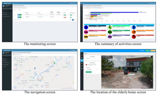 The data from the tracking device are matched with the data of the elderly who use the device. The system classifies activities and records in the database, which can be monitored in real-time via the web application. The monitoring screen shows the status of device information, users, device activation (online/offline), and recent activities. Users can view a summary of past activities of the elderly. The system shows the duration of each recorded activity, which helps to understand the activity in the daily life of the elderly. Furthermore, the geographical location data from the device is used to identify the elderly position on an online map. The system uses this information in conjunction with the geolocation of devices that enable web applications to enable navigation from users to the elderly. Examples of these screens are shown in Figure 11.