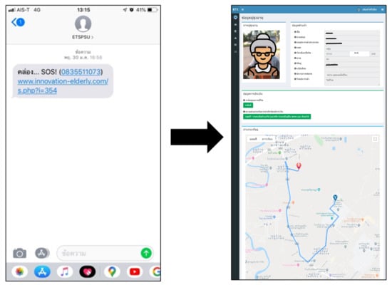 Regarding emergency cases, we designed the system to respond to activities that are expected to be harmful to the elderly. When the classification system finds a fall activity, it will send a notification message to the phone number of the caregiver in the form of SMS. The caregivers who receive the information can immediately check the information in the system or call back to check the safety of the elderly. Furthermore, the system has a function to request emergency assistance by pressing a button on the wearable device. This function sends a help message to the caregivers or agencies involved in caring for the elderly in the community. The information sent will help identify relevant information for the elderly and encourage more comfortable and faster access to help. The information includes personal information, disease and personal medicine, photos, and directions to the location of the elderly, as shown in Figure 12.