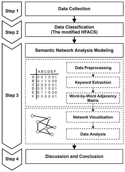 In the data collection stage, construction accident cases from 2014 to 2018 collated by the Korea Occupational Safety and Health Agency (KOSHA) were collected, and approximately 60,000 suitable data were finally selected. The collected data were text data in which the accident summaries were comprehensively recorded in sentence form, including the various accident causes. To analyze the accident causes within such an unstructured dataset, significant manual classification was required. Consequently, during the data classification stage, the collected data were manually classified by 15 specialized human resources, based on the modified human factor analysis and classification system (HFACS) framework consisting of 4 levels—that is, unsafe behavior, preconditions of unsafe acts, unsafe supervision, and organizational influences—and 17 sub-factors. In the SNA modeling stage, two big data analysis techniques—that is, text mining and semantic network analysis—were used to analyze large volumes of text data. In the text mining stage, data preprocessing was performed using Python 3.9.0, and morphemes were analyzed using the KoNLPy library. Subsequently, words that were targets for detailed analysis were extracted. Meaningless words and noise that were extracted during the morpheme analysis process were removed to identify keywords among the analyzed data. After preprocessing was completed, top-level factors appearing frequently were selected from among the extracted keywords, and the Numpy and Pandas libraries were used to examine the frequency at which these words appeared simultaneously and to arrange connection relationships in the form of an adjacency matrix. In the SNA stage, the extracted adjacency matrix was visualized using Gephi 0.9.2—an open-source network analysis tool—to create a network showing the connection relationships between keywords, with the major content then being analyzed.
