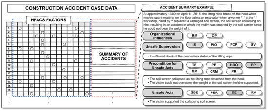 The main type of information used in this study was accident summaries. In the accident summaries, it was possible to see the major factors and causes of unsafe acts based on the accident circumstances. The accident summary describes the type of accident—such as a fall, collapse, pinching, falling—including where, when, and in what place the accident occurred, during what process, with what type of machine/equipment, and doing what type of work. In particular, it includes any unsafe conditions regarding machinery, equipment, structures, and the working environment at the time of the accident and any specific human factors relating to the unsafe behavior of the injured or fellow workers. The collected accident case data contain sufficient information to analyze the causes of HFACS-based construction accidents despite the various levels of detail used to describe each accident. As such, the cases caused by specific human error factors were classified based on the modified HFACS framework (which included 17 factors). At this stage, the accident cases were arranged as rows, and the human error factors (17 factors) were arranged as columns. When a certain factor contributed to an accident in an accident case, the corresponding text content was entered in that factor’s cell. Figure 2 shows an example of the HFACS factor classification method. The accident summary shown indicates that the safety management supervisor failed to check the (insufficient) status of rope connections, which is clearly their responsibility. This caused an unexpected situation in which the lifting rope broke off a hook and a soil screen collapsed, resulting in an accident which injured a worker, even though the victim was aware of the danger of collapse. As a result of the classification, four sub-factors were identified as the cause of the accident—that is, inadequate supervision, hazard by others, physical problem, and decision error—suggesting that the accident occurred due to the combined influence of each factor. After classification was completed, SNA was performed on the accident case data, the data being used to find correlations in the unsafe acts for each of the HFACS factors.