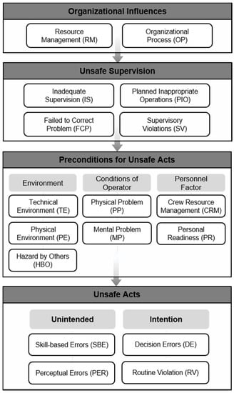 When the HFACS was first developed, it was classified into 20 sub-items within 4 major categories: that is, (1) unsafe acts, (2) preconditions for unsafe acts, (3) unsafe supervision, and (4) organizational influences [,]. When the HFACS is used, it has the advantage of being able to distinguish between latent failures and active (human) failures at each level. Latent failures include factors such as inadequate organizational management practices, inadequate or missing resources, supervisor violations, inadequate equipment design, and inadequate personnel training and procedures. Conversely, active (human) failures include unsafe acts that occur close to the moment when an accident occurs.