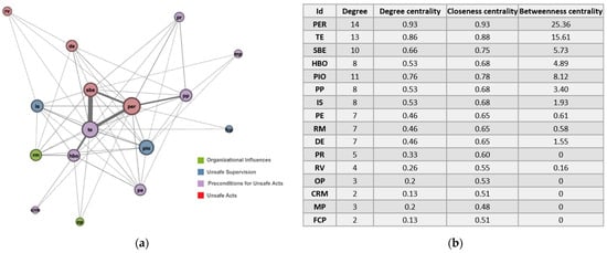 Figure 4a shows the overall network diagram, and Figure 4b shows the degree, degree centrality, closeness centrality, and betweenness centrality values for each factor in the SNA results. A total of 16 nodes appeared in the approximately 60,000 data—except for ‘supervisory violations (SVs),’ which had less than 50 instances—and 56 links were formed between the nodes. It is thought that there were so few SVs because managers excluded their own mistakes when reporting accidents in most cases.