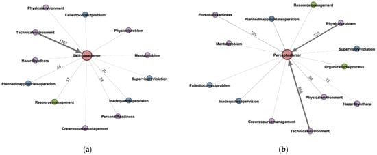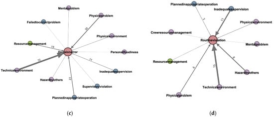 Network diagrams of unsafe act factor analysis results: (a) skill-based errors (SBEs) network diagram; (b) perceptual errors (PERs) network diagram; (c) decision errors (DEs) network diagram; (d) routine violations (RVs) network diagram.