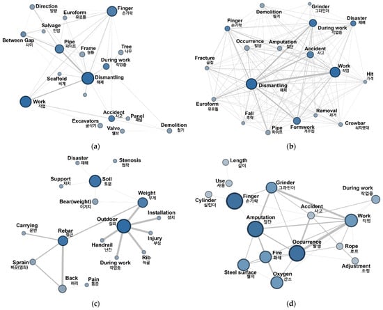 - Technical environment (TE)-PER/SBE: The combinations ‘TE’ and ‘SBE’ (weight: 1367) and ‘TE’ and ‘PER’ (weight: 868) had the highest weight values among the mutual relationships between the HFACS factors. The analysis results for these two combinations were similar. Figure 6a,b show network graphs that display their major keywords and the correlations between them. It can be seen that most of the extracted keywords that both factors had in common were from accidents that occurred during demolition and dismantling work (18.63%) and installation work (12.46%). In particular, the values of nodes such as ‘dismantling,’ ‘during work,’ ‘(scaffold) pipe,’ ‘formwork,’ and ‘finger’ were large, the connections between these nodes being prominent. This phenomenon shows that the degree of hazard caused by work environment factors (TE) (upper floor work, narrow work environments, lack of work platforms and fall prevention nets, hazards from falling material, etc.) was high in demolition and dismantling work in comparison to other types of work. Such hazardous work environment factors during dismantling work may combine with the ‘PER’ factor (for example, being unable to see material falling from above) and the ‘SBE’ factor (such as mistakes in the sequence of dismantling tasks due to unskilled labor) to cause fatal accidents.