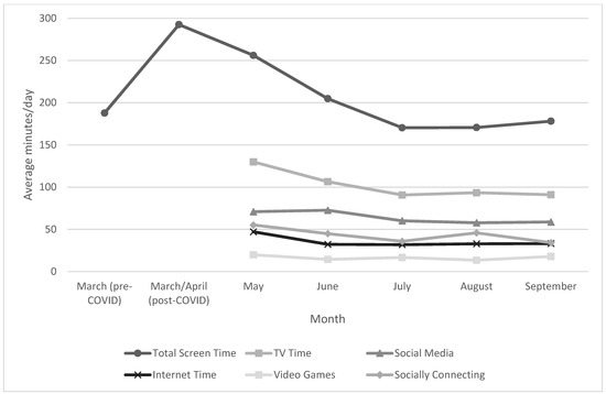 All data were processed using IBM SPSS Statistics (version 25). Basic demographics are reported as means and standard deviations. Due to the low level of video game play among the sample (i.e., only 20–26% reported any video game play), the variable was removed from further analysis. Five separate one-way repeated measures analysis of variances (RM-ANOVAs) were conducted to determine differences in recreational screen time (pre-COVID 19, late March/April, May-September each month), watching television (once a month from May–September), using social media (once a month from May–September), using the Internet (once a month from May–September), and using screens for socially connecting with others (once a month from May–September). Assumptions (i.e., outliers, normality, and sphericity) were considered and addressed, as needed, prior to conducting each one-way RM-ANOVA. Post hoc analyses, with Bonferroni adjustments, were completed on any significant findings.