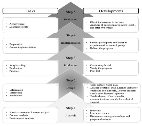 The purpose of Step 2 was to construct educational content and teaching methods. In this step, the educational goals, contents, methods and strategies, environment, and evaluation were specified through the Consensus-Oriented Decision-Making (CODM) process and a content validity index (CVI) with an expert group for the areas of information design, text, pictures, and video data. Next, learners were asked to interact with each other while solving a quiz to check their understanding of the content on the basis of their interactions. The program was designed to allow learners to react to and to check each other’s opinions and answers, using email and social media as channels for interacting with other learners and instructors. Strategies for motivation, such as primary education, were established, and a communication channel with researchers through social media was also designed to provide technical support if needed.