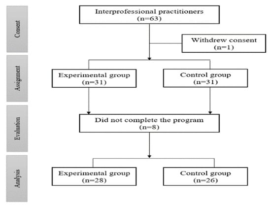 Figure 3 presents the process of participant selection used in this study. A total of 63 people participated, 54 of whom completed the educational program in four LTCFs in South Korea. The inclusion criteria for this study were as follows: (1) more than one year of work experience in an LTCF, and (2) currently working at an LTCF. G*Power 3.1.9.4 (Heinrich-Heine-Universität, Düsseldorf, Germany) was used to calculate the sample size. When the power was 0.8, the significance level was 0.05, and the effect size was 0.80 [], on the basis of which both experimental and control groups of this study were confirmed to have proper sample size. Of the 54 participants in this study, 28 were in the experimental group and 26 in the control group.