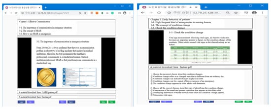 The web-based educational program developed consists of five chapters. Chapter 1 provides an overview of emergencies and early patient detection and includes the frequency of emergencies in LTCFs, concept of condition change, checking for condition change, professional knowledge, and the skills of interprofessional practitioners. Chapter 2 elaborates on minimizing patient injuries by providing definitions of airway obstructions, falls, and infections, while including information on patient assessment, first aid, and the role(s) of practitioners in emergencies. Chapter 3 focuses on the preparation of patient transport to the emergency department (ED) describing the patient information needed for treatment in the ED and the first aid that should be provided in the facility before transfer to an ED. Chapter 4 discusses the prevention of emergencies through identifying residents’ underlying diseases upon admission to LTCFs for determining those at high risk of experiencing emergencies, while depicting environmental management and the role of practitioners in preventing emergencies. Finally, Chapter 5 explains efficient communication between practitioners, the importance of communication, and the concept of the situation–background–assessment–recommendation (SBAR) framework and how to use it. Figure 4 shows the screen that the participants were able to view.