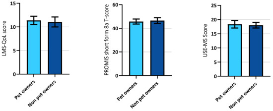 No significant differences were seen in LMS-QOL, SPSR, and USE-MS scores between pet owners and non-pet owners living with MS (see Figure 1).