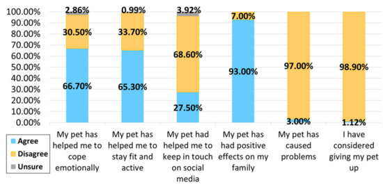 Perceived roles of pets during the pandemic: Participants were asked to indicate their level of agreement with a series of five statements regarding the roles of their pets during the pandemic using a Likert scale with the following answer options: ‘strongly agree’, ‘somewhat agree’, ‘disagree’, ‘strongly disagree’. The statements included concerned the effects of pets on family (having positive effects or causing problems), physical activity (“keeping fit and active”), social interaction (“my animal is the reason I keep in touch with some people and social media groups”), and emotional coping (“my animal helps me cope emotionally with the COVID-19 situation”) during the pandemic. Participants were also asked to answer ‘yes’, ‘no’, or ‘prefer not to say’ to indicate if they had considered giving up their pet due to COVID-19.