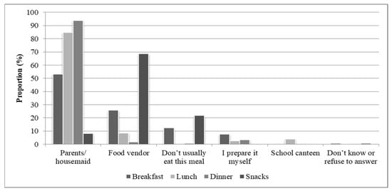 When the in-school students (n = 1059) were asked who prepared their meal during the day, only 4% reported going to the school canteen for lunch and none went there for breakfast, dinner or snacks (Figure 2). The majority of the students received their meals from their parents or housekeeper: 53% for breakfast, 85% for lunch, and 94% for dinner. Less than 10% of the students reported that they prepared the meals themselves and 12% reported that they did not have breakfast in the morning. With regard to snacking, 78% of the students (n = 799) consumed snacks, which were purchased by 69% of these students from food vendors located within or immediately surrounding the school property. Specifically, 26% purchased their breakfast and 8% their lunch from a food vendor. Of those students who purchased snacks the previous day (n = 534), the majority consumed refined grains and baked goods, juices, liquid oils (e.g., olive oil, vegetable oil, or coconut oil), sweets and ice cream, processed meat, and sugar-sweetened beverages (Figure 3).