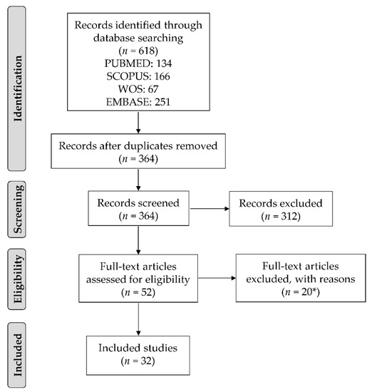 Figure 1 summarizes the study selection process. We identified 618 articles through the four electronic databases. After the exclusion of duplicates, 364 articles were screened based on titles and abstracts, and 52 articles were identified as potentially eligible. Of them, 20 were excluded following full-text evaluation (Figure 1). Therefore, 32 articles were included in this review.