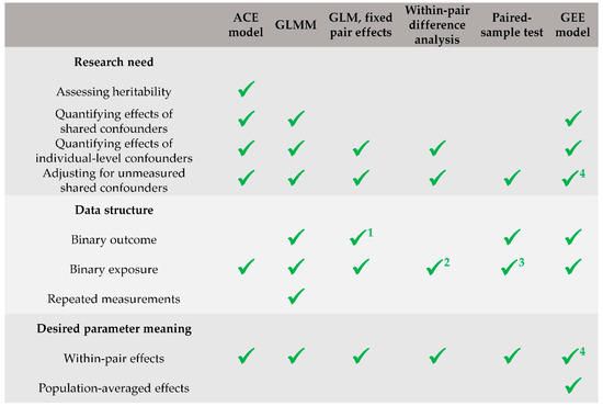 In practical applications, the best (or sufficient) approach to use may depend on the research needs, data structure, and desired parameter meaning. ACE models can accommodate for most of the research needs, including the assessment of heritability, but they require adaptations for binary outcomes and repeated measurements. GLMMs are a valid choice if assessing heritability is not a research need, and they would be the best choice to accommodate for binary outcomes and repeated measurements. GLMs with fixed pair effects and within-pair difference analyses are good (and substantially equivalent) approaches when the effects of shared confounders do not need to be explicitly quantified, but only the former can accommodate for binary outcomes (conditional logistic regression is recommended). If either the outcome or the exposure is binary, and confounding effects are assumed to be marginal (e.g., if the twins are substantially identical except that for the exposure of interest), paired-sample tests can be a valid alternative to more complex models. The use of GEE models (marginal models) for logistic regression should only be limited to situations in which the researchers are interested in estimating population-averaged effects rather than within-pair effects. In these cases, however, the twin design is not strictly needed, and is not more useful than a singleton study (except that for increasing the sample size). Finally, GLMs should never be used in a twin study, since they may lead to sub-optimal inference. Figure 2 provides a summary of recommendations regarding which types of models researchers should favor under different conditions (research needs, data structure, and desired parameter meaning).