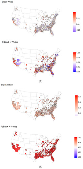Spatial distribution of BAA–nHW disparities in log rate of heart diseases and stroke mortality among 875 counties in the US. (A) Heart Disease; (B) Stroke.