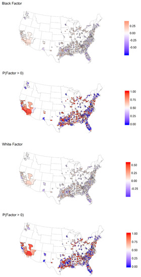 Spatial distribution of posterior mean estimate of the county race-specific factor and the posterior probability that it is above average.