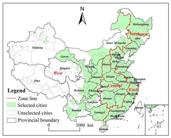 China’s administrative regions are divided into following levels: 34 first-level (provinces), 334 s-level (prefectures), and 2851 third-level (counties). Regionally, China is divided into four main regions: eastern, central, western, and northeastern China [42]. In order to explore the change dynamics and influencing factors of CEE in prefecture-level cities in China, considering the limitation of data unavailability, 283 complete analysis sample cities were used, which account for more than 84 percent of the country’s total. The spatial distribution of the sample cities is shown in Figure 2.