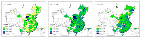 Spatial distribution pattern of carbon emission efficiency at the city level in China, in (a) 2005, (b) 2010, and (c) 2017.