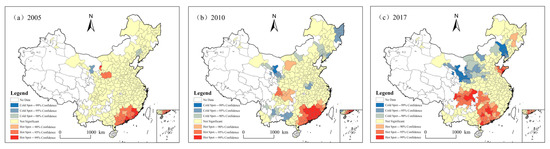 Getis-Ord Gi* maps for carbon emission efficiency at the city level in China, in (a) 2005, (b) 2010, and (c) 2017.