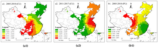 The regression coefficients of CU to CEE are shown in Figure 5(a1,a2). During 2005–2010 and 2011–2017, the influence of CU on CEE showed obvious spatial dependence, and the regression coefficients are all negative. In 2005–2010, the regression coefficient is a gradient distribution pattern: along the northeast-southwest direction decreases, and the coefficient of the largest in the northeast region distribution. Due to the rapid development of urban industrialization in northeast China and the rapid development of heavy industry dependent on energy consumption, the negative impact on carbon emission efficiency is great.