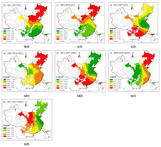 From 2011 to 2017, the spatial distribution characteristics of SOU’s influence on CEE are contrary to the previous period, showing a change characteristic of western China being larger than central China and larger than eastern China, and SOU’s promoting effect on CEE is found throughout the country. This shows that after the implementation of the low-carbon city policy in 2010, more and more people began to adopt low-carbon lifestyle, and urban industrialization slowly began to transform into a knowledge-based economy and clean industrial structure, which slowed down the growth rate of carbon emissions.