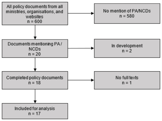 The initial list served as a guide for two trained research assistants to retrieve and screen policy documents from the archives of the ministries. The research assistants also asked archive attendants and key informants at the ministries about relevant documents that could meet the inclusion criteria. Our initial search identified 600 policy documents for possible inclusion. Upon screening the document titles, executive summaries (abstracts), and table of contents, 580 did not meet the inclusion criteria (these had no specific relevance to PA and NCDs). Two documents were further excluded because they were still being developed. One document was excluded for lack of full text. Seventeen documents were included for the final data extraction.