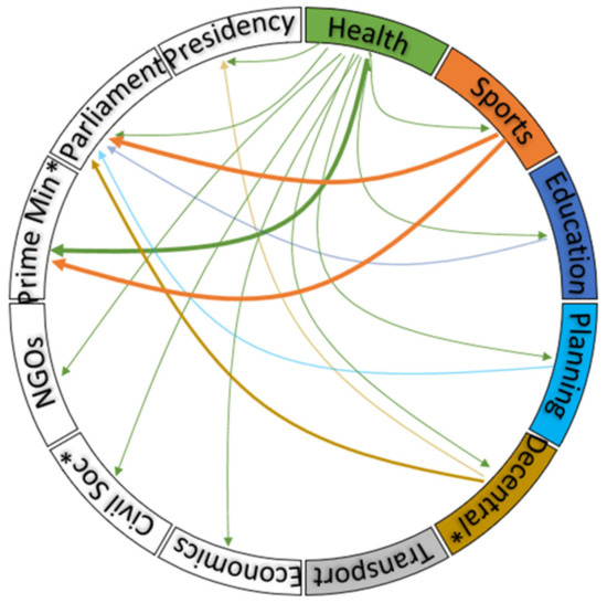 The main sectors involved in policies that influence PA included the Ministries of Sport and Physical Education, Health, Decentralisation (Local Governance and Development), Education, Urban Planning, and Youth Affairs. Figure 2 shows the main sectors and with whom they collaborated in the development of policies. The transport sector did not have policies that mentioned PA. The health sector involved multiple sectors in the development of its strategic plans, although the participating sectors did not have corresponding plans reflecting their engagement with the Ministry of Health.