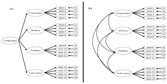 Factor model of temperance depicting one second-order factor structure hypothesized to underlie the four first-order factors; e—error; item—question of the temperance scale; (a)—second-order model; (b)—four-first-order factors model.