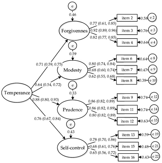 Final factor model of temperance depicting a one-dimensional second-order factor. Note: The 95% CI of the standardized factor loadings are represented in parentheses.