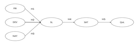 Proposed conceptual model. Notes: FRI = friends, DEV = deviance, NAT = nature, SL = serious leisure, SAT = satisfaction, QoL = quality of life.