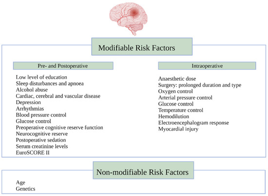 In addition to the type of surgery, the stroke risk is increased in patients with existing cerebrovascular disease, peripheral vascular disease, diabetes, hypertension, a history of previous cardiac surgery, preoperative infection, urgent surgery, cardio-pulmonary bypass (CPB) time of more than 2 h, the need for intraoperative hemofiltration, and high transfusion requirements [18]. Risk factors for cognitive decline post cardiac surgery are multifactorial (Figure 1). The neurological outcomes are diverse and have previously been classified as Type I (includes fatal or non-fatal stroke, stupor, or coma at discharge) and Type II, which includes cognitive function deterioration, memory deficit, or seizures [22].