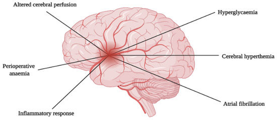 The mechanism of cardiac surgery-related brain injury is complex and multifactorial. The most common mechanism results from ischaemic causes leading to cerebral hypoperfusion and embolism [26,27]. In addition to ischaemic causes, the inflammatory response, cerebral hyperthermia, hyperglycaemia, perioperative anaemia, and atrial fibrillation have also been implicated (Figure 2) [27].