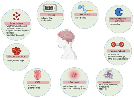 The quantity and complexity of major cardiac surgeries and procedures is constantly expanding. This population is at risk of postoperative complications, further compounded by physiological and surgical risk factors. Therefore, there is a growing need to mitigate against risk factors associated with neurological injury in the perioperative period. Contemporary data on neuroprotective strategies in children and adults undergoing cardiac surgery are associated with controversies due to multiple contributing factors to brain injury and the assessment of long-term neurocognitive outcomes [40]. Figure 3 demonstrates a schematic representation of the pathophysiology of neurological deficits during CPB, with possible pharmacological and non-pharmacological interventions [28].