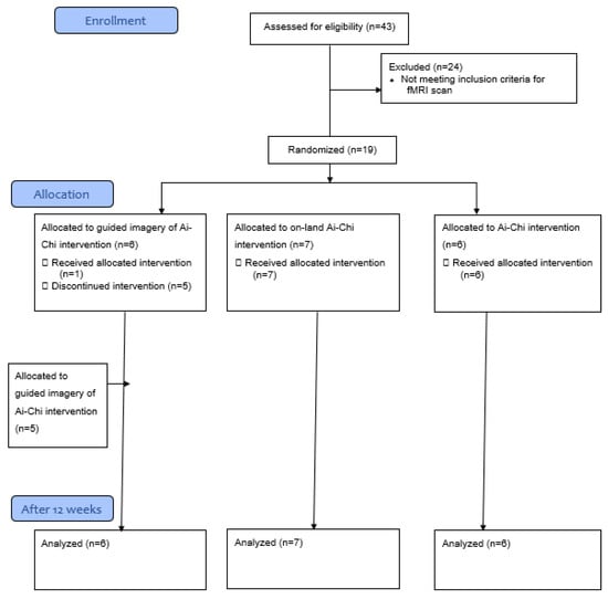Enrollment began in April 2018. All participants who met the inclusion criteria for the pilot study were allocated to three intervention groups: 6 participants attended the structured Ai-Chi, 7 participants the structured on-land Ai-Chi, and 6 participants the guided imagery of Ai-Chi. Simple randomization was generated by a research coordinator.