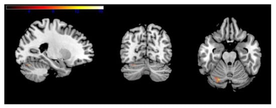 In the whole-brain analysis, no significant differences in activation were found in the low working memory load. Nonetheless, in the high working memory load, the Ai-Chi group presented a decrease in cerebellar activation located in the left cerebellum_6 (based on the AAL atlas) (Figure 2) (Table 3).