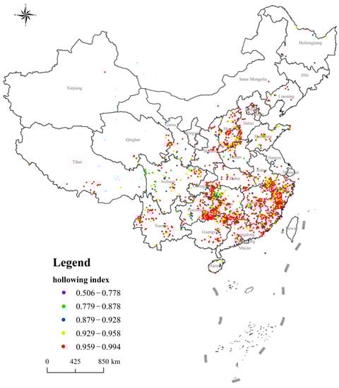Traditional villages with a hollowing index greater than 0.9 were distributed in all provinces. Traditional villages with hollowing index greater than 0.8 and less than 0.9 accounted for 6.31% and were mainly distributed in the provinces of Anhui, Fujian, Guangdong, Guangxi, Guizhou, Hainan, Hebei, Henan, Hubei, Hunan, Jilin, Jiangxi, Liaoning, Shandong, Shanxi, Shaanxi, Sichuan, Yunnan, Zhejiang, and Chongqing. Traditional villages with hollowing index greater than 0.7 and less than 0.8 accounted for 0.98% and were mainly distributed in Anhui, Fujian, Gansu, Guangdong, Guangxi, Guizhou, Hainan, Henan, Heilongjiang, Hunan, Jilin, Jiangxi, Liaoning, Shandong, Shanxi, Sichuan, Zhejiang, and Chongqing. Traditional villages with hollowing indexes greater than 0.6 and less than 0.7 accounted for 0.30% and were found in Fujian, Guangdong, Guangxi, Henan, Shanxi, and Zhejiang. Traditional villages with a hollowing index greater than 0.5 and less than 0.6 accounted for 0.11% and were mainly distributed in Hainan, Henan, and Zhejiang (see Table 4).