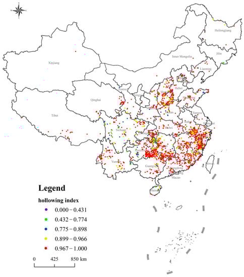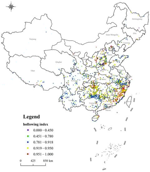 Distribution of Chinese traditional villages hollowing index.
