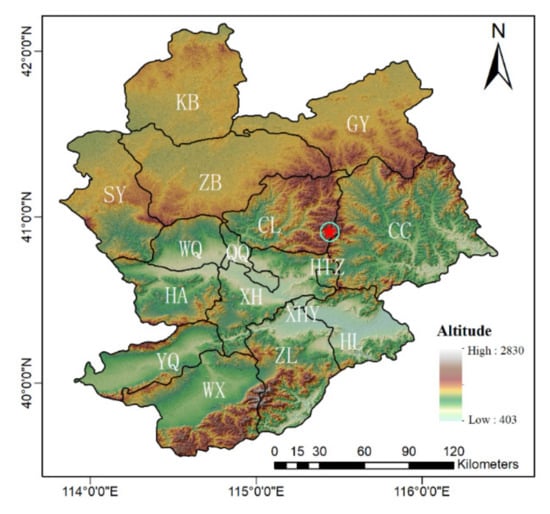 Our research area is located in the area of Zhangjiakou City, Hebei Province, China, which is one of the three competition zones of Beijing Winter Olympic Games. The whole region has a temperate continental monsoon climate, with precipitation between 300 and ~500 mm, and an average altitude of 1148 m. There are 16 districts or counties in Zhangjiakou (Figure 1). All the venues of Zhangjiakou competition Zone of Winter Olympic Games are located in Chongli district.