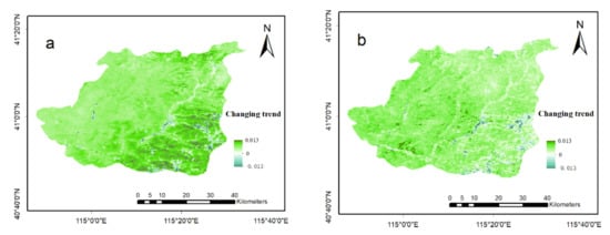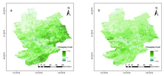 Increasing trend of vegetation of Zhangjiakou area, Hebei Province, China. (a,b) show the trend of vegetation change from 2000 to 2020 of Normalized Difference Vegetation Index (NDVI) and Enhanced Vegetation Index (EVI), respectively. The deeper the green, the greater the increase of vegetation coverage, and the opposite for blue.