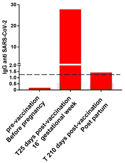 Following these considerations, the evaluation of the behavior of the immune system of a women subjected to COVID-19 vaccination during pregnancy acquires even more interest. According to the data presented, the woman was largely positive on the DBS serological test 25 days after the second vaccination dose, but slightly below the medians already described in our previous work [].
