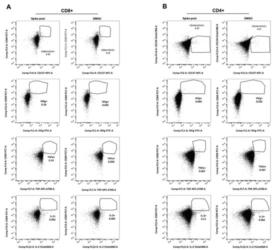(Panel A) gating of CD8 + cells analyzed for CD69 and CD137 expression as well as for the production of cytokines INFg, TNFa and IL-2 in women, stimulated sample (Spike pool) vs. negative control (DMSO). (Panel B) gating of CD4 + cells analyzed for CD134 and CD137 as well as for the production of cytokines INFg, TNFa and IL-2 in women (Spike pool) vs. negative control (DMSO). Collection of the woman’s sample and gating analysis was performed 7 months after complete vaccination administration—post-partum.