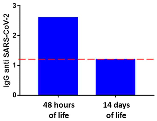 A further interesting aspect that the authors would like to underline concerns the use of the DBS samples for the evaluation of IgG anti-SARS-CoV-2 antibody. In fact, serological tests were performed not only on the mother but also on the newborn after 48 h and after 14 days of life. Interestingly, the use of DBS sampling is minimally invasive and able to allow an advantageous alternative to existing analytical procedures such as sampling by venepuncture or nasal swabs. Thanks to the easy collection, it is suitable for self-sampling, for example, in critical situations such as quarantine [].